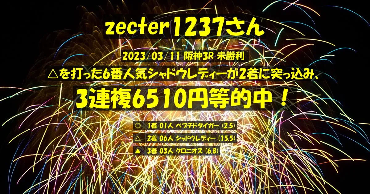🎯zecter1237さん🎯 阪神3R 未勝利 、3連複6510円等的中!(399%)