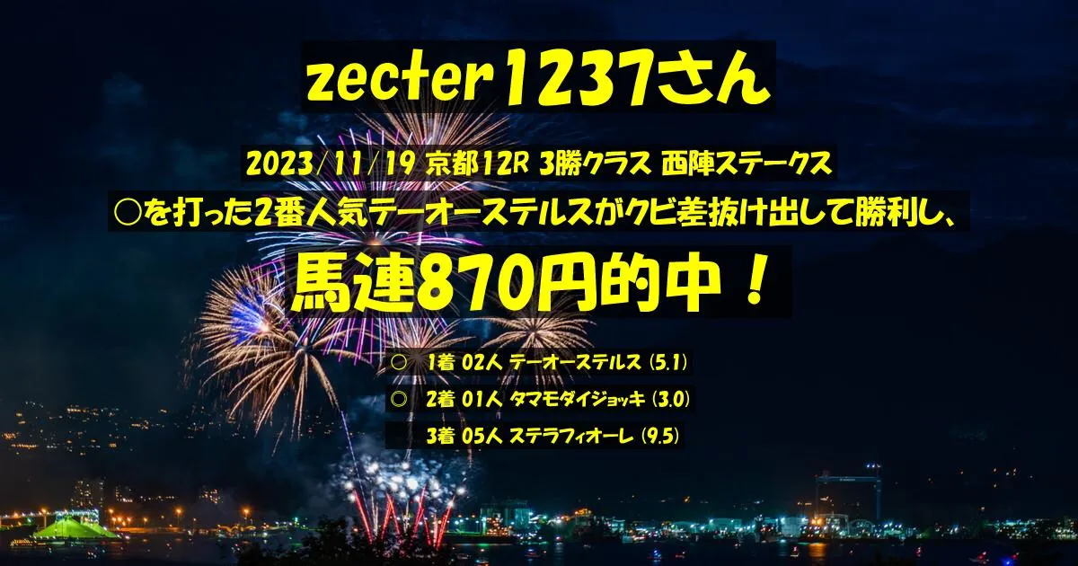 🎯zecter1237さん🎯 京都12R 3勝クラス 西陣ステークス、馬連870円的中!(387%)
